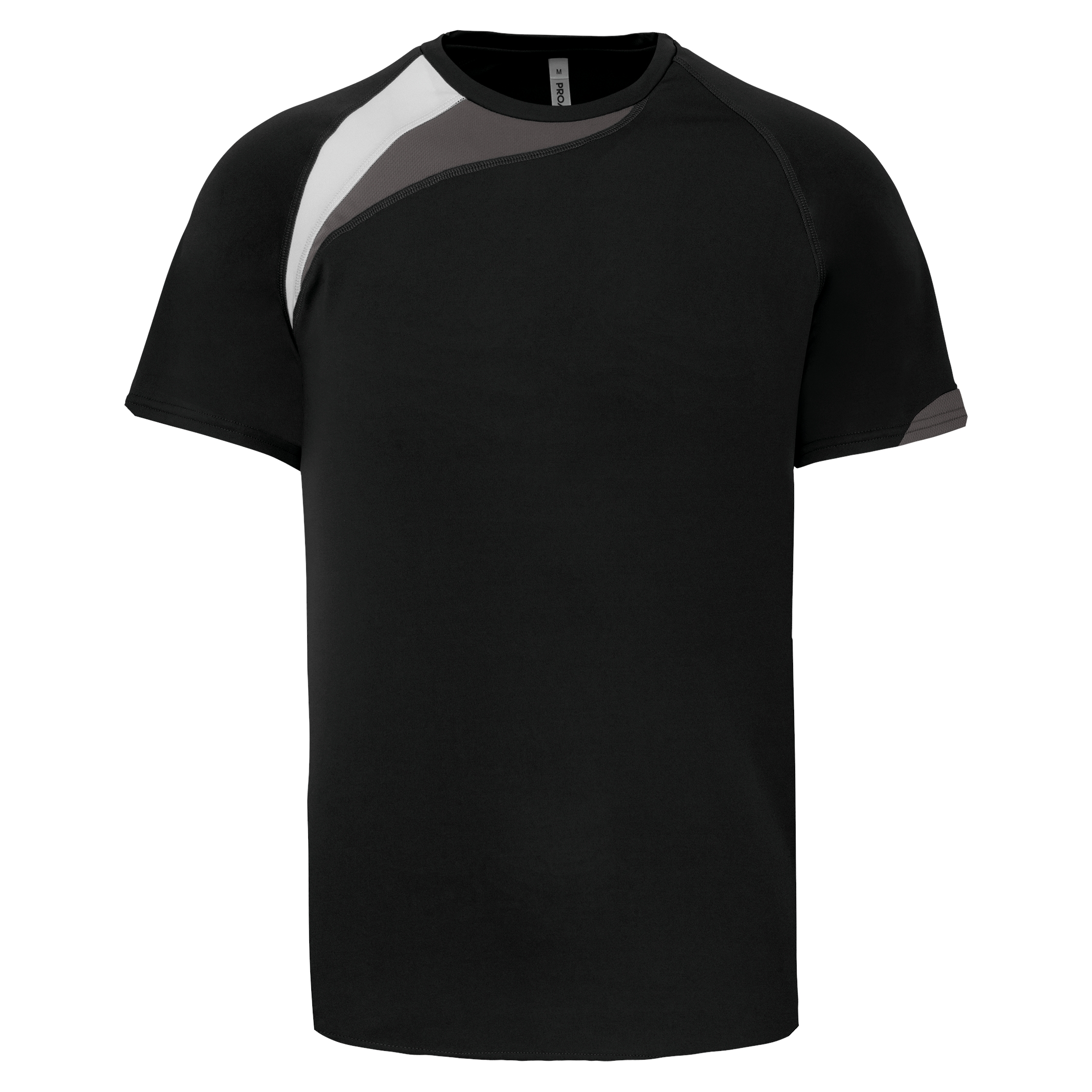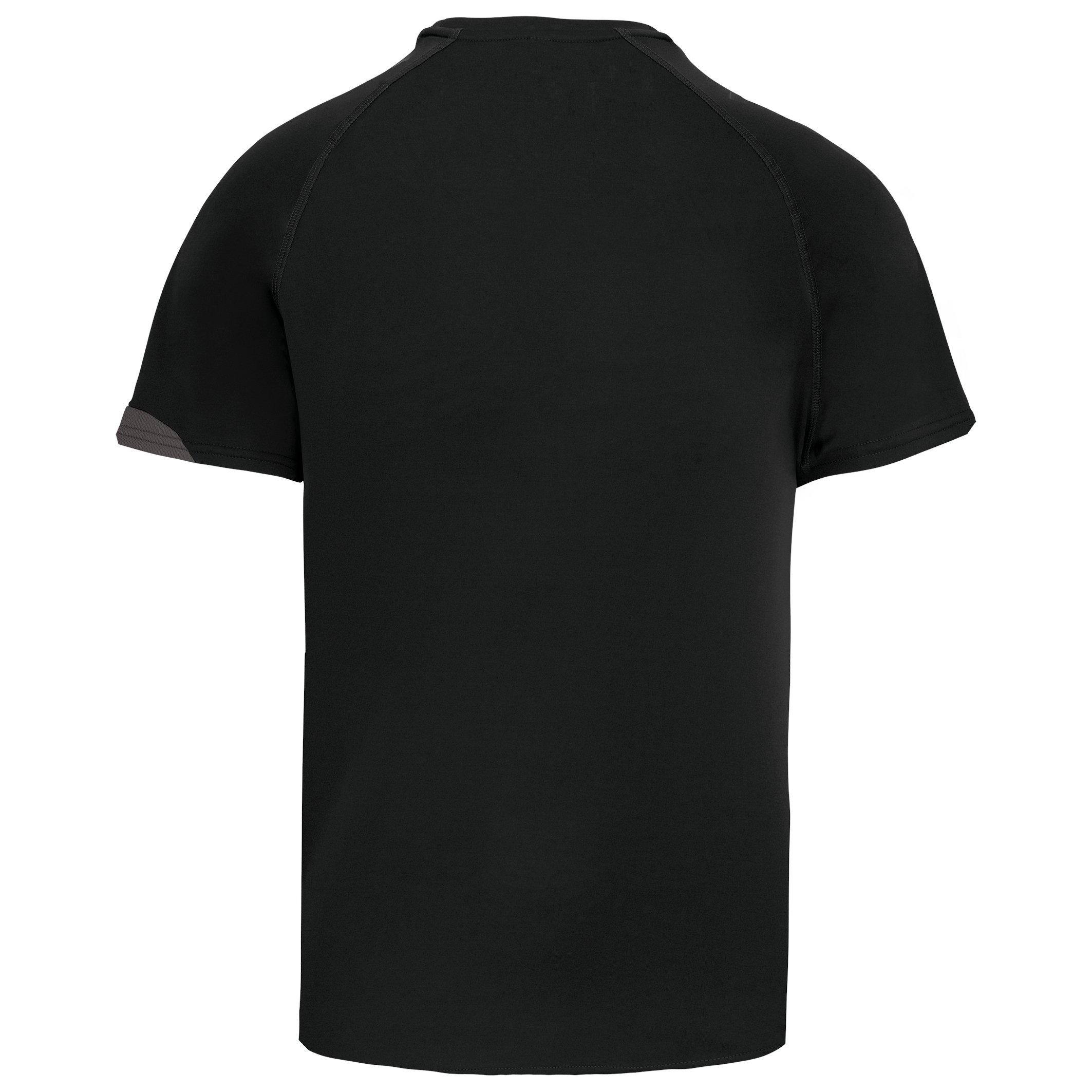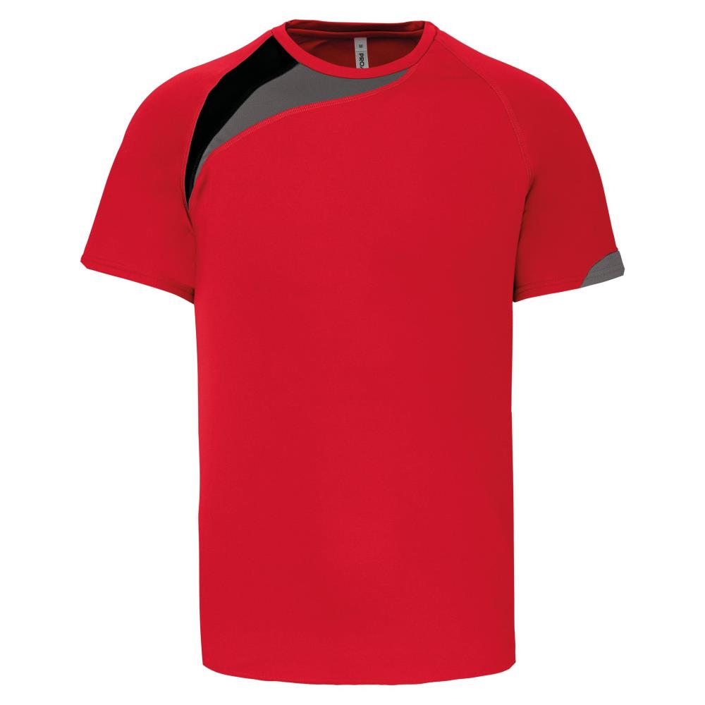 100% polyester. Inzetstukken in contrastkleur op de borst en mouwuiteinde. Overstiksels toon op toon. Afwerking met dubbele stiksels onderaan en aan de mouwuiteinden.
