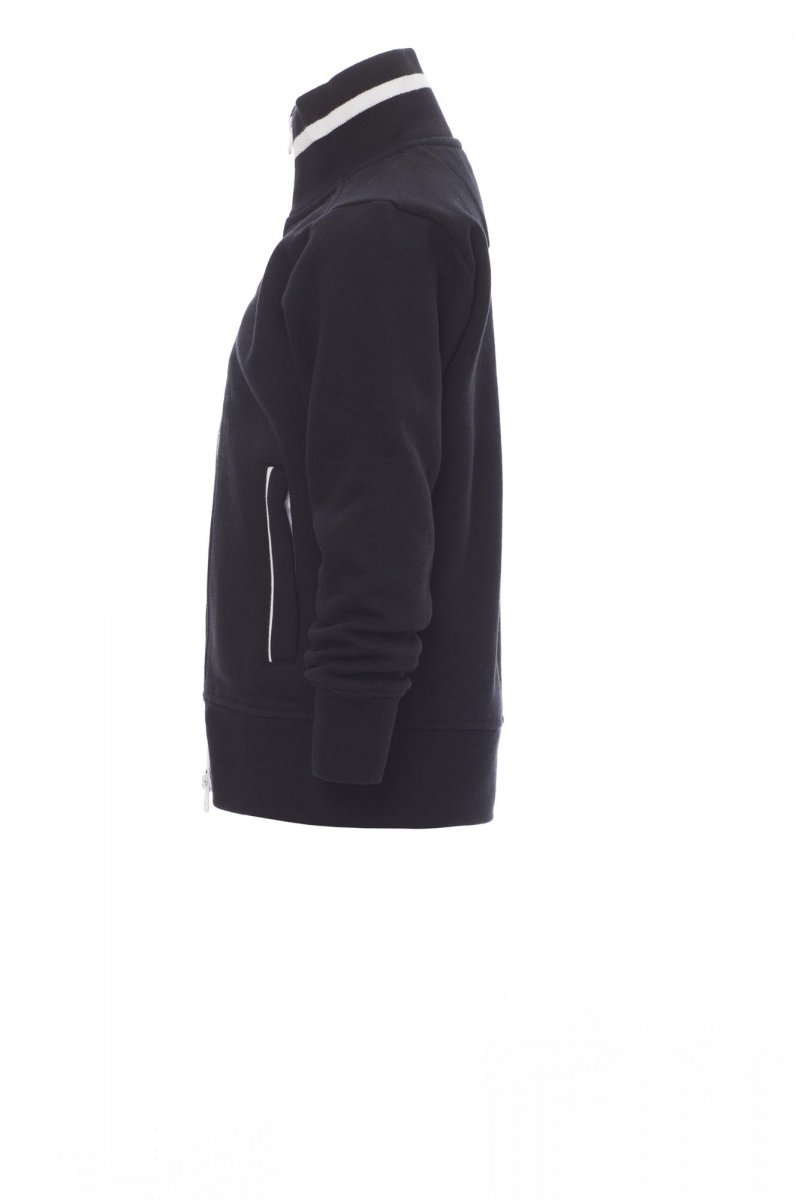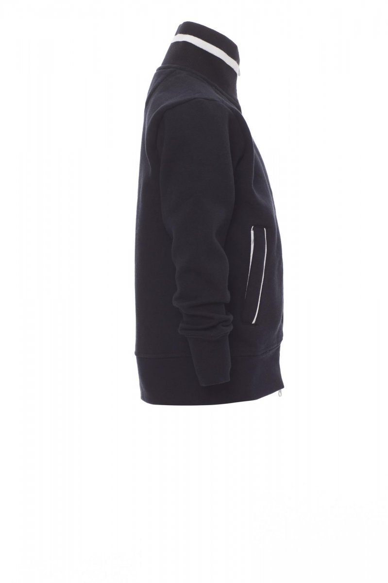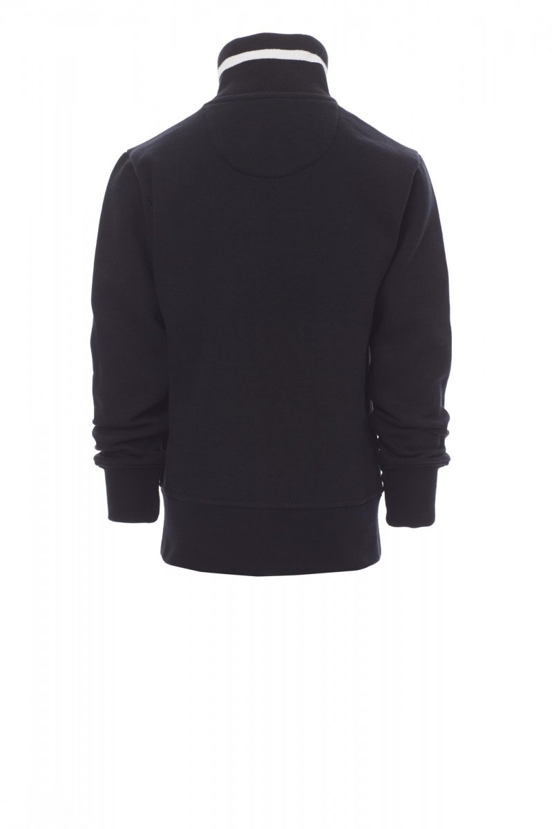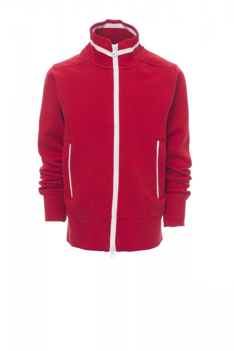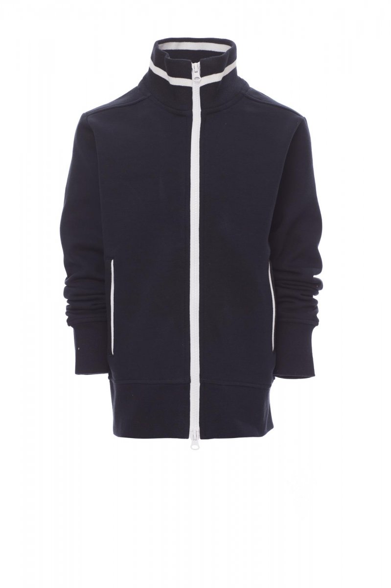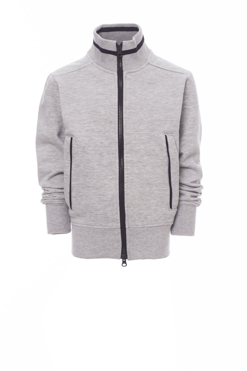 Kindersweatshirt met doorlopende kunststof SBS-rits in contrasterende kleur met dubbele metalen runner. Ribkraag met contrasterende rand, zakken opzij met contrasterende rand, nauwsluitende mouwen, twee buitenzakken met contrasterende rits, ribboorden met stretch aan zoom en mouwen, versterkte naden.