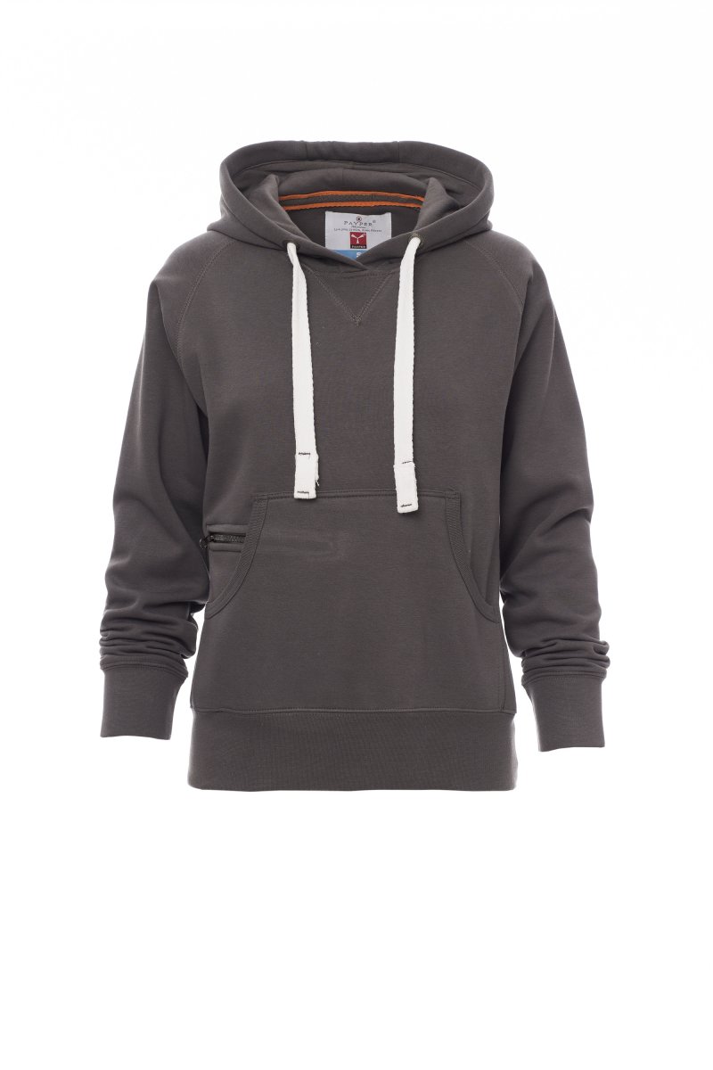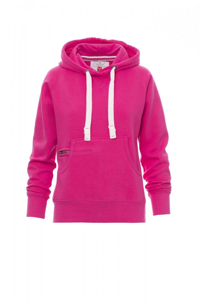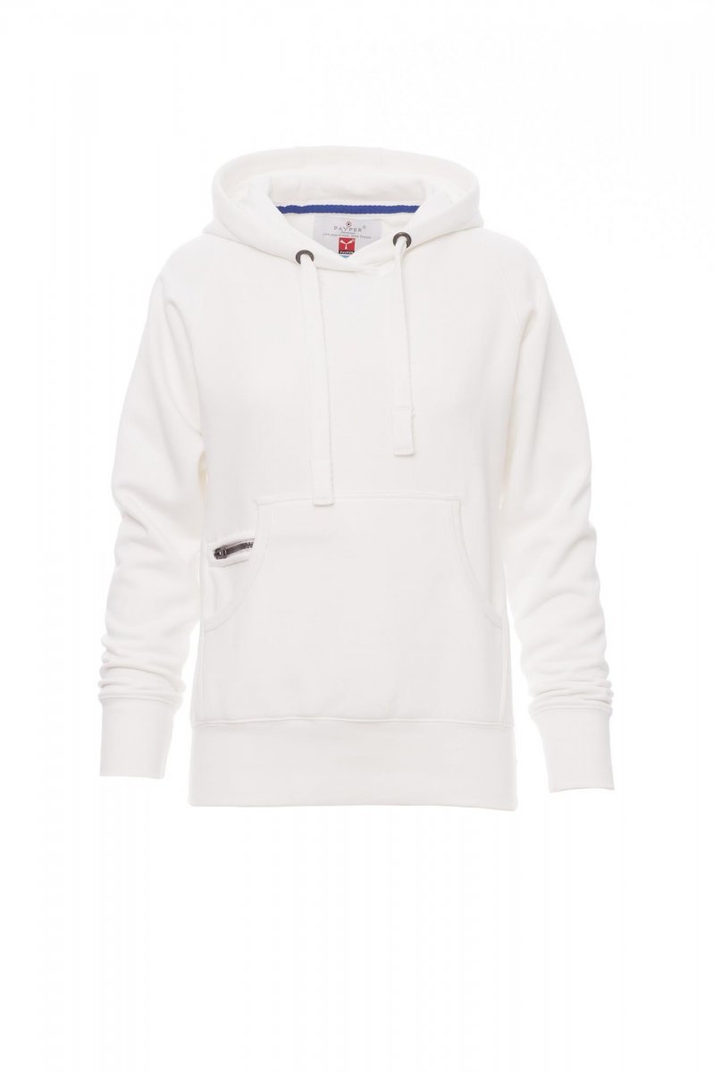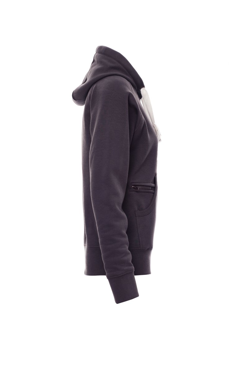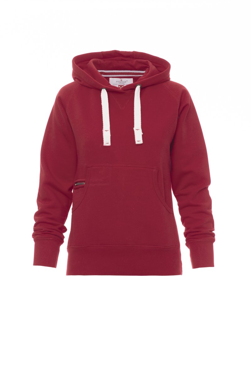 Nauwsluitende dameshoodie met dubbel gestikte naden en wit trekkoord met contrasterend stiksel en metalen ringen, raglanmouwen, V-stiksel bij de hals, kangoeroezakken, kleine zak met rits, ribboorden met stretch aan de zoom en mouwen, versterkte naden.