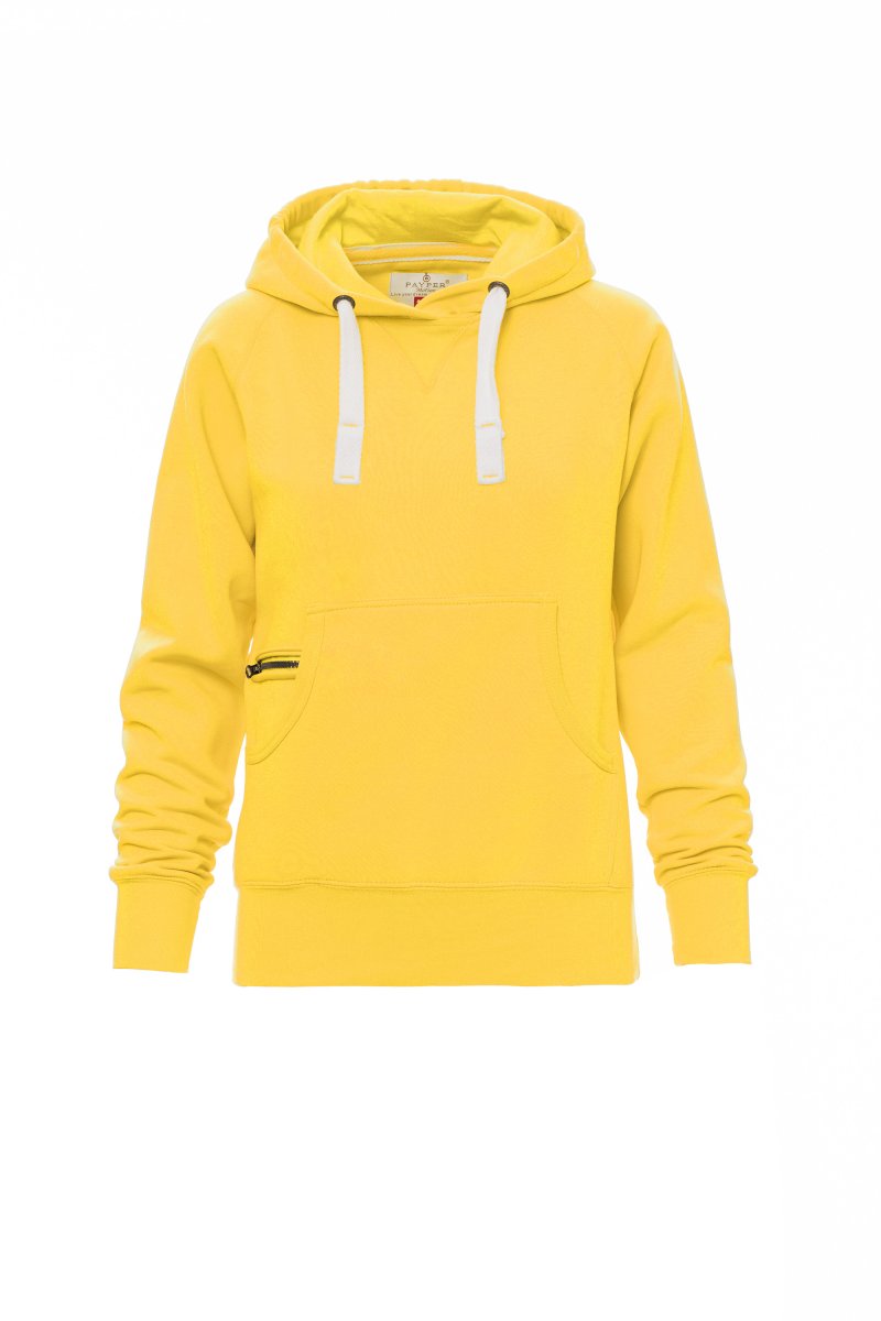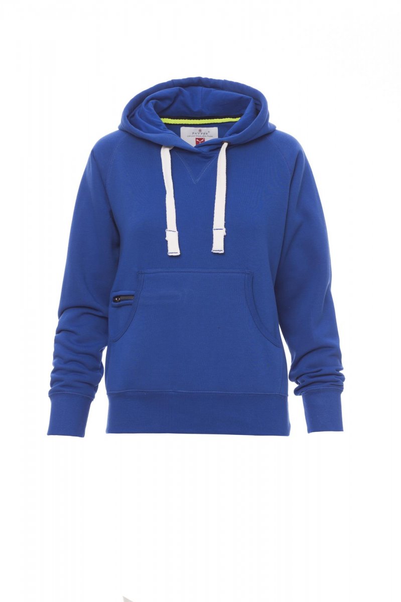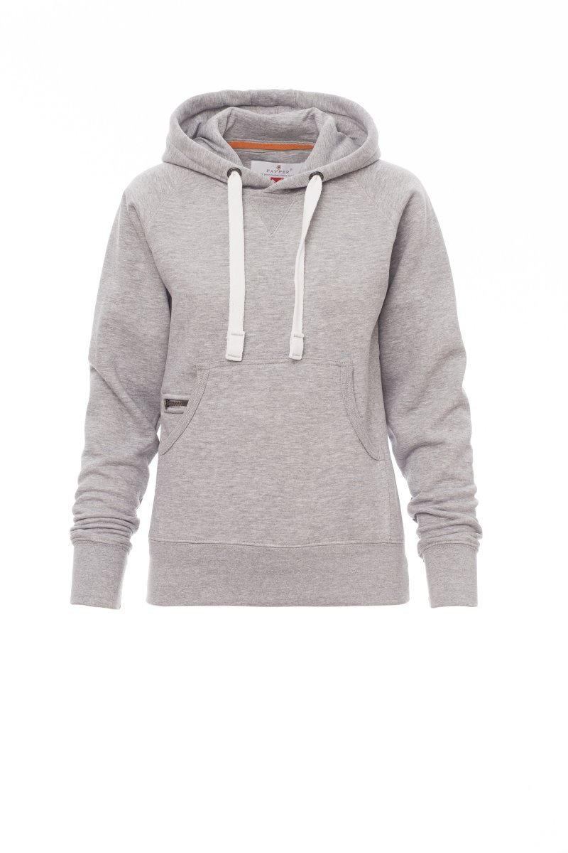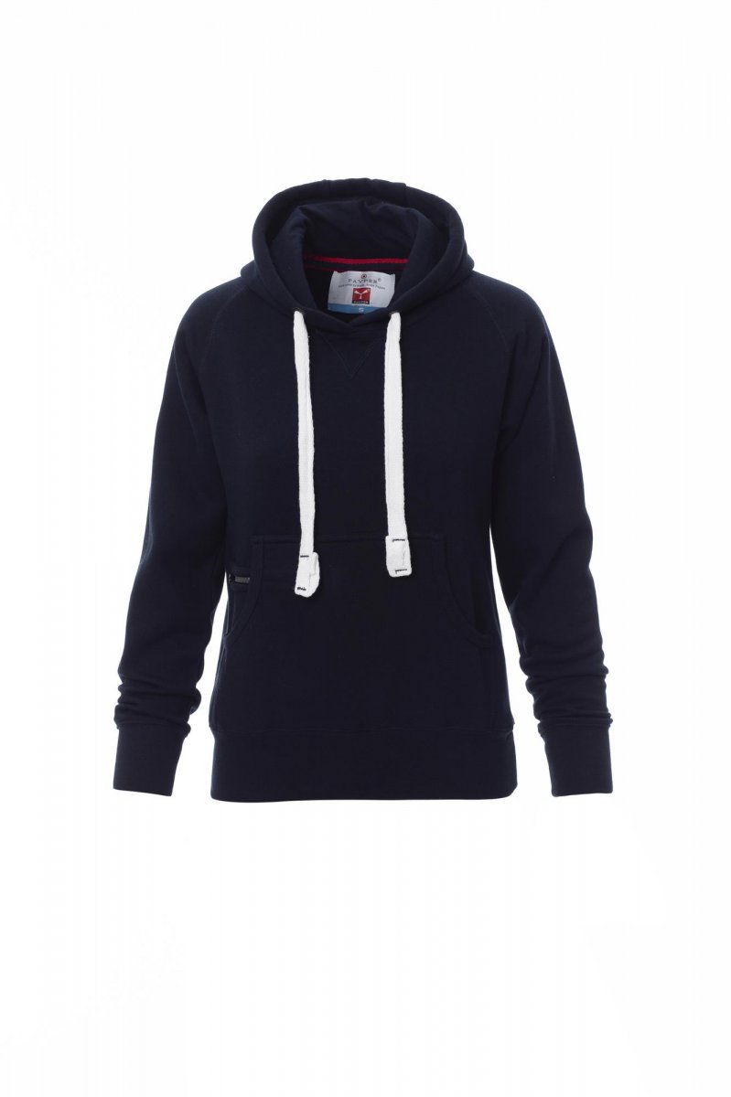 Nauwsluitende dameshoodie met dubbel gestikte naden en wit trekkoord met contrasterend stiksel en metalen ringen, raglanmouwen, V-stiksel bij de hals, kangoeroezakken, kleine zak met rits, ribboorden met stretch aan de zoom en mouwen, versterkte naden.