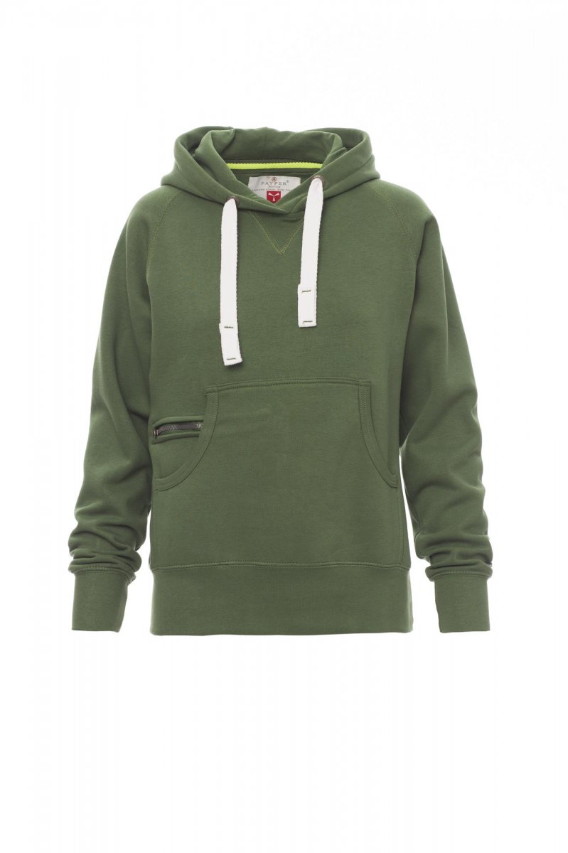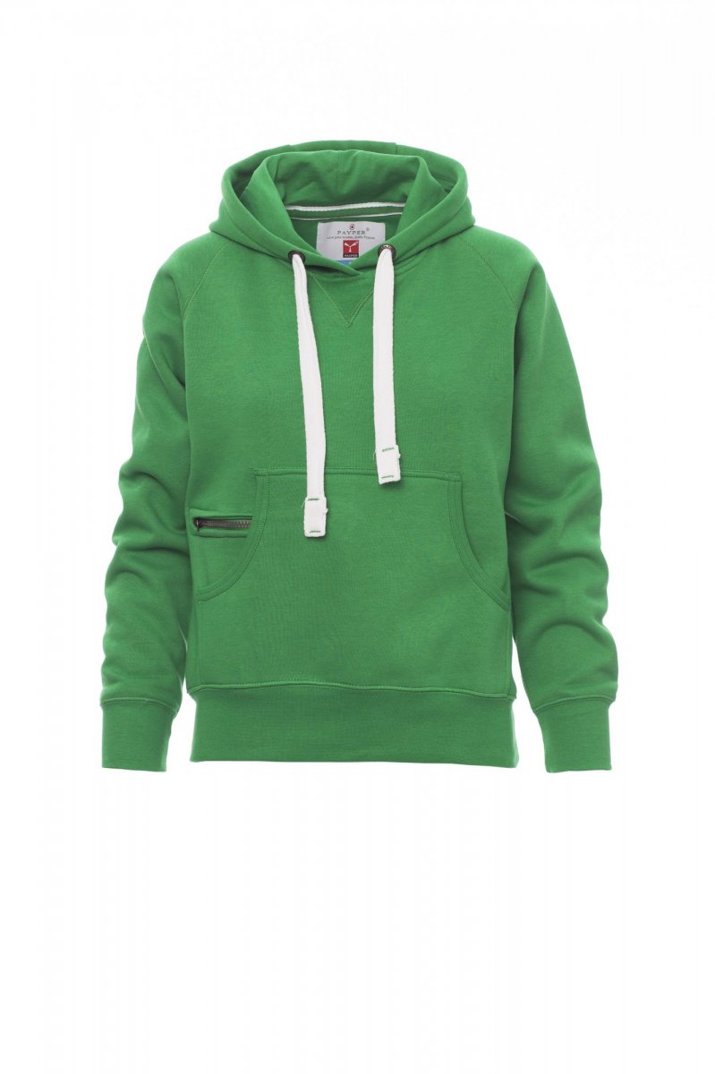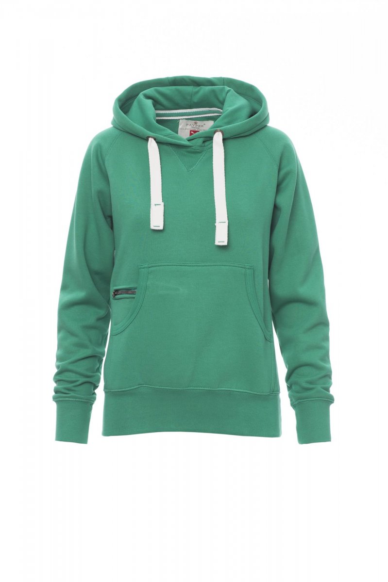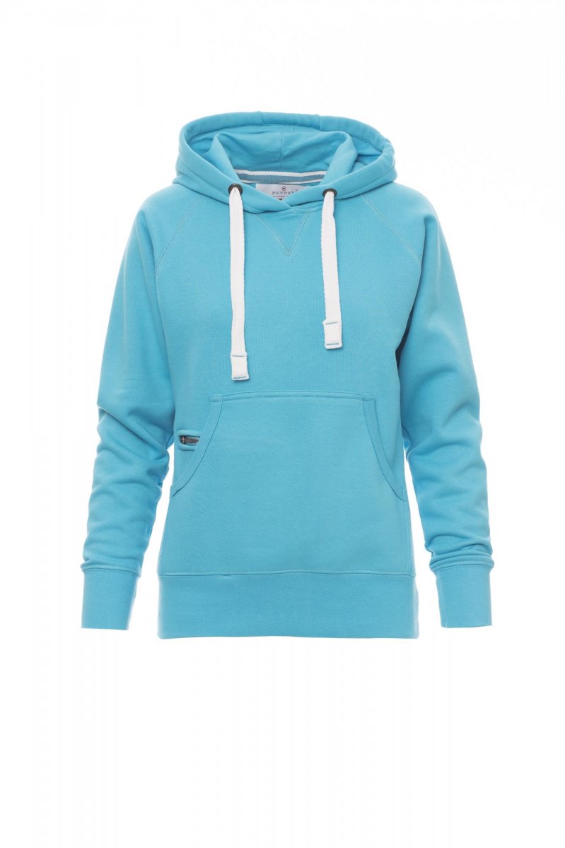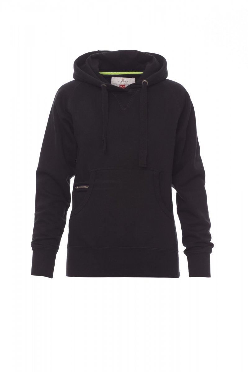 Nauwsluitende dameshoodie met dubbel gestikte naden en wit trekkoord met contrasterend stiksel en metalen ringen, raglanmouwen, V-stiksel bij de hals, kangoeroezakken, kleine zak met rits, ribboorden met stretch aan de zoom en mouwen, versterkte naden.