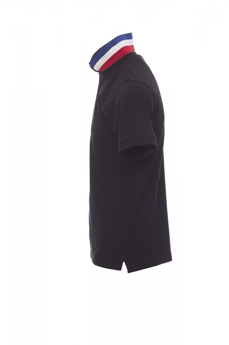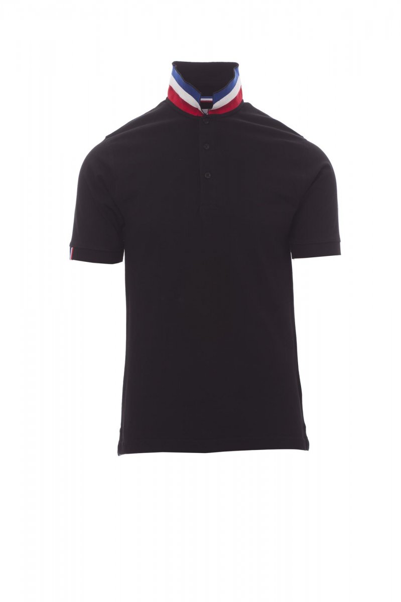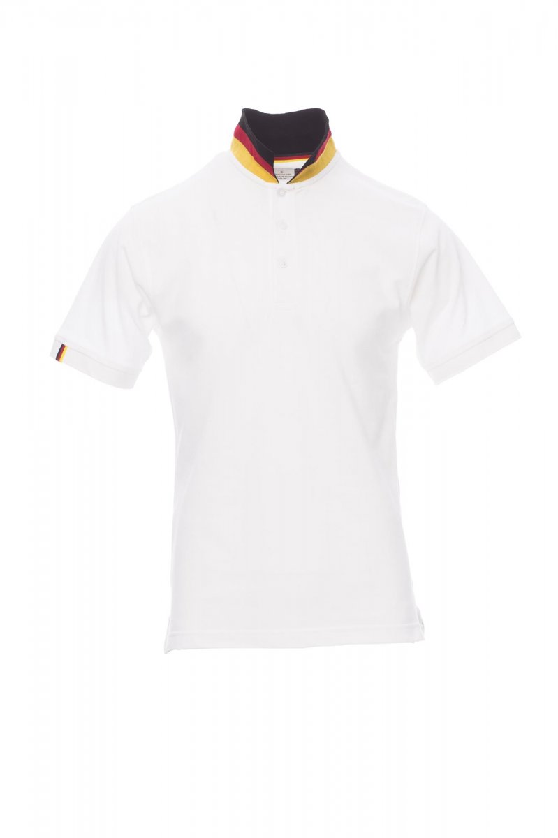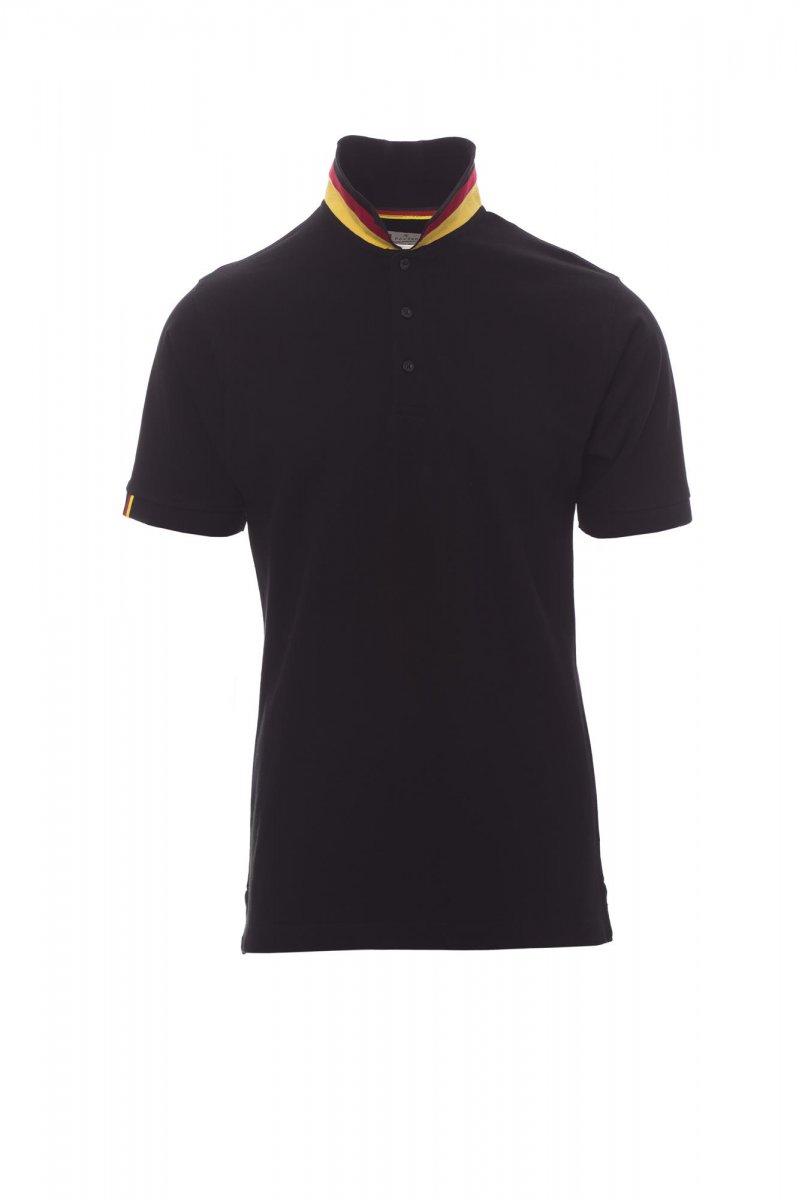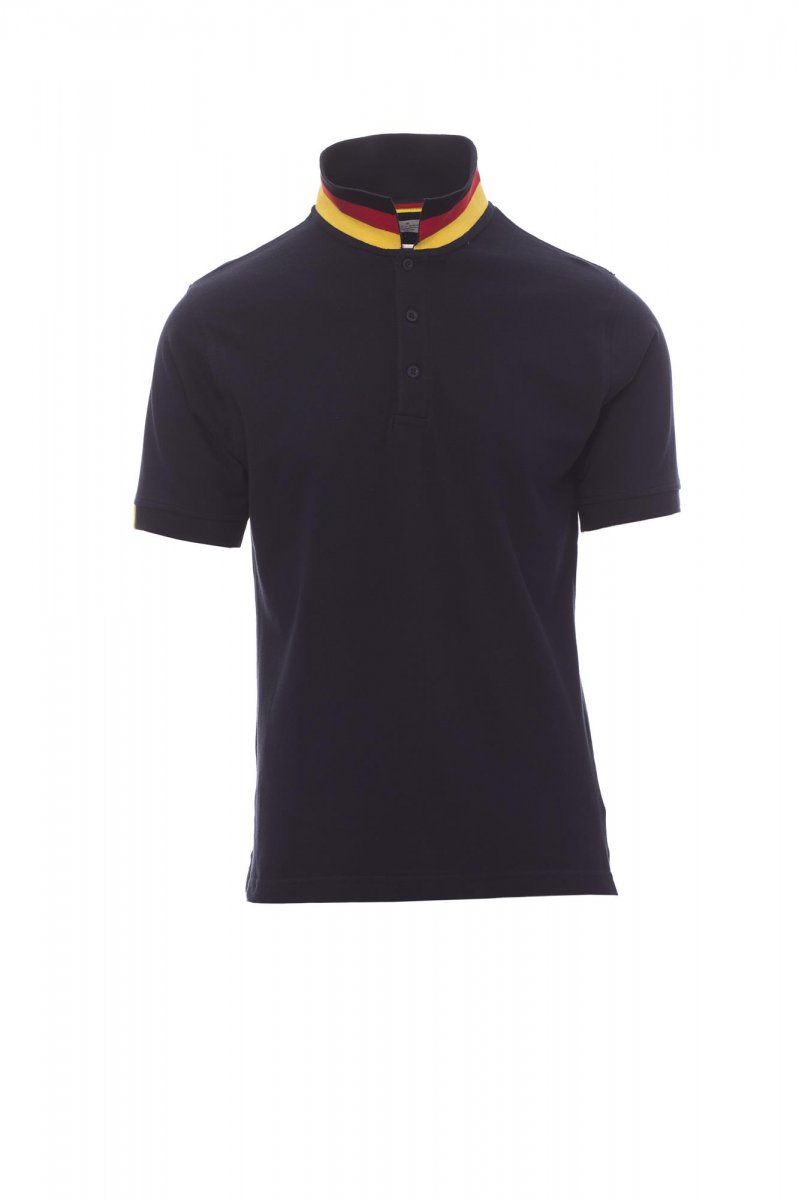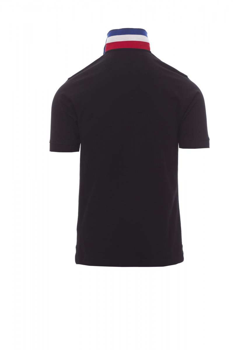 Herenpoloshirt met korte mouwen met 3 bijpassende knopen met parelmoereffect, bijpassende kraag met contrasterende onderkant (kleuren van de vlag), rechte mouwrand in kleur (dezelfde kleur als de kraag), geribde kraag- en mouwrand, rand van zijsplitten in kleuren van de vlag, verborgen stiksels bij de kraag met jersey band (kleuren van de vlag), versterkingsband aan de zijkant, band aan de binnenzijde van de nek.