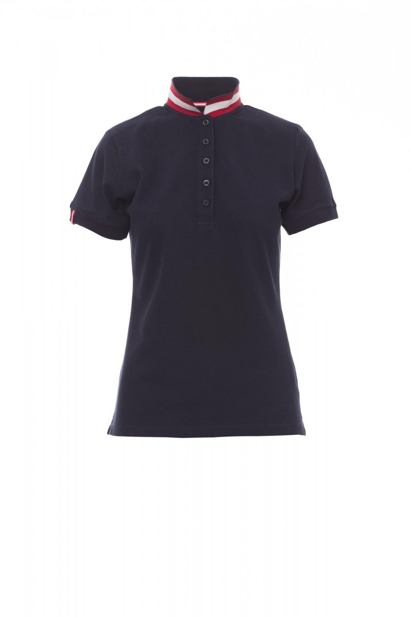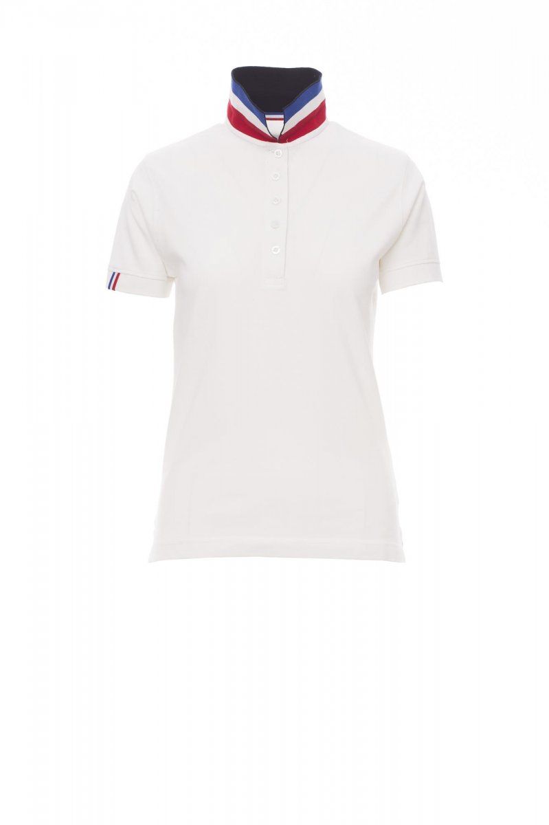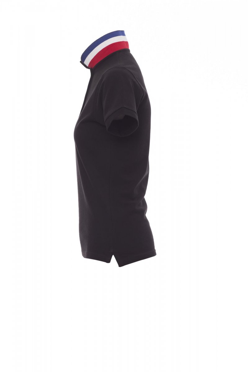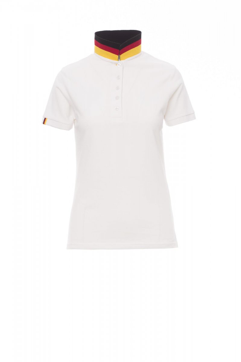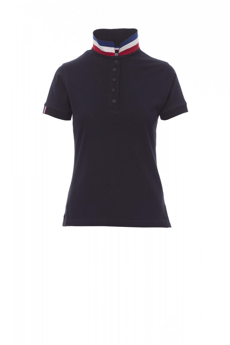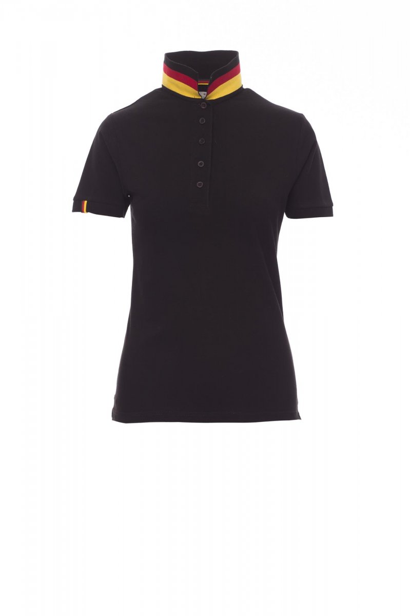 Nauwsluitend damespoloshirt met korte mouwen met 5 bijpassende knopen met parelmoereffect, bijpassende kraag met contrasterende onderkant (kleuren van de vlag), rechte mouwboord in kleur (dezelfde kleur als de kraag), geribde kraag- en mouwrand, rand van zijsplitten in kleuren van de vlag, verborgen stiksels bij de kraag met jersey band (kleuren van de vlag), versterkingsband aan de zijkant, band aan de binnenzijde van de nek.