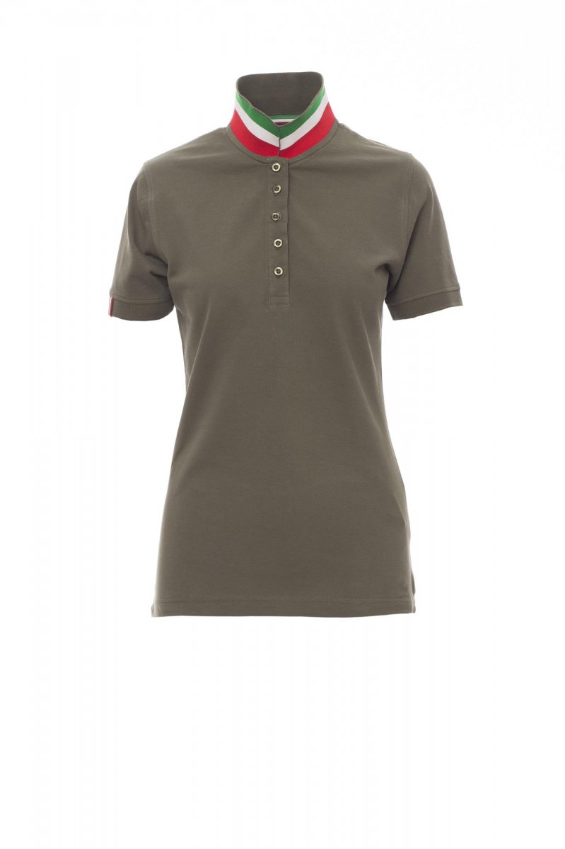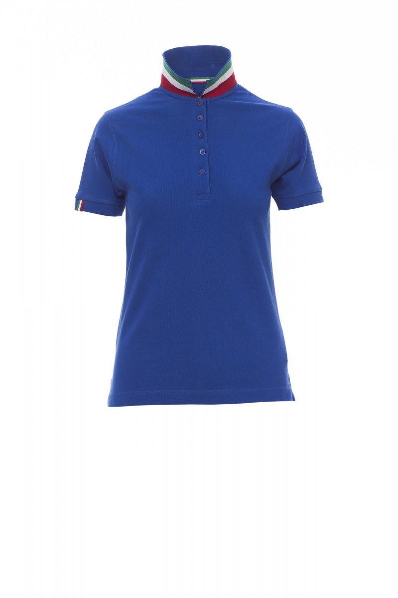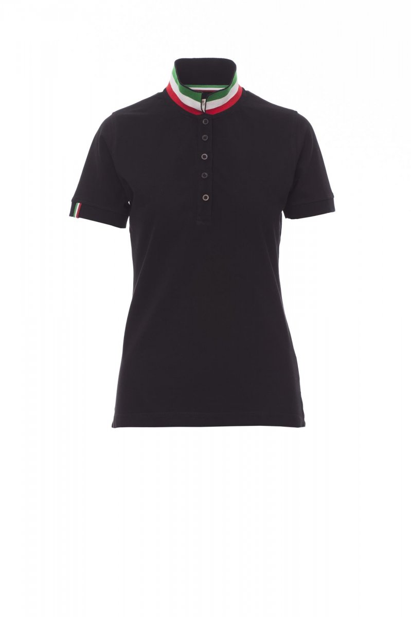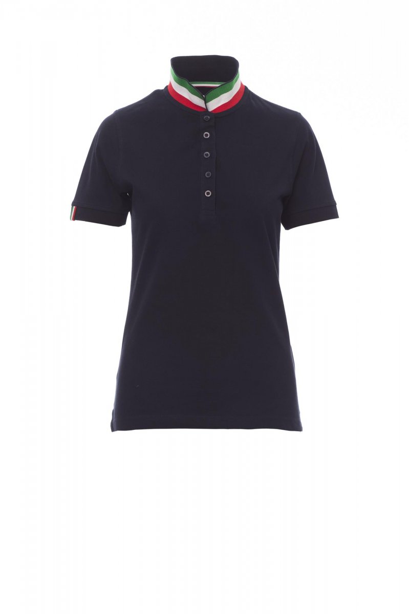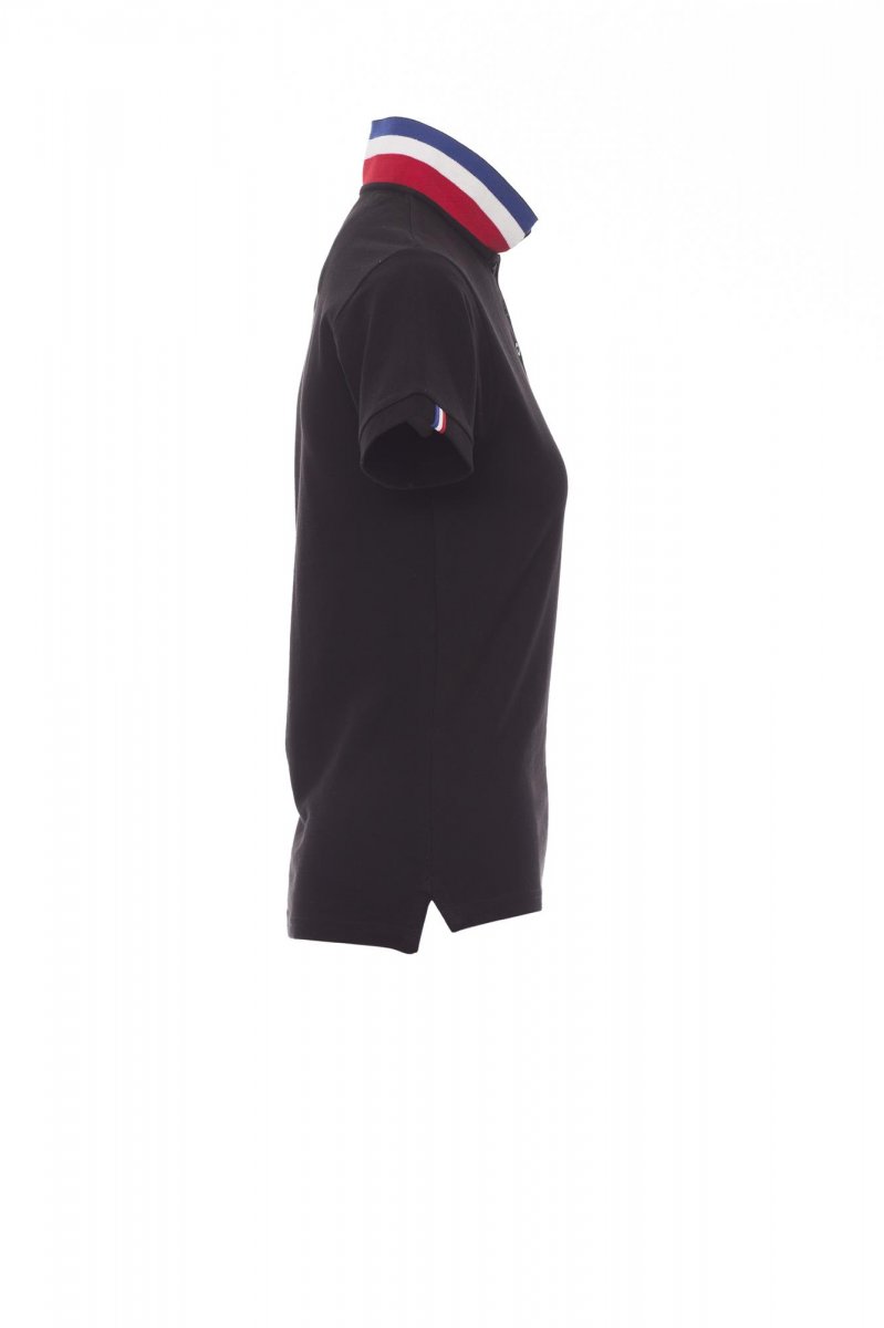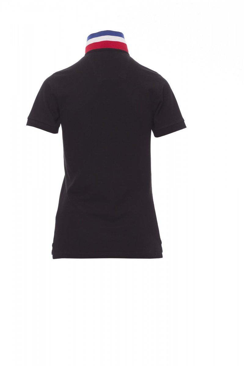 Nauwsluitend damespoloshirt met korte mouwen met 5 bijpassende knopen met parelmoereffect, bijpassende kraag met contrasterende onderkant (kleuren van de vlag), rechte mouwboord in kleur (dezelfde kleur als de kraag), geribde kraag- en mouwrand, rand van zijsplitten in kleuren van de vlag, verborgen stiksels bij de kraag met jersey band (kleuren van de vlag), versterkingsband aan de zijkant, band aan de binnenzijde van de nek.