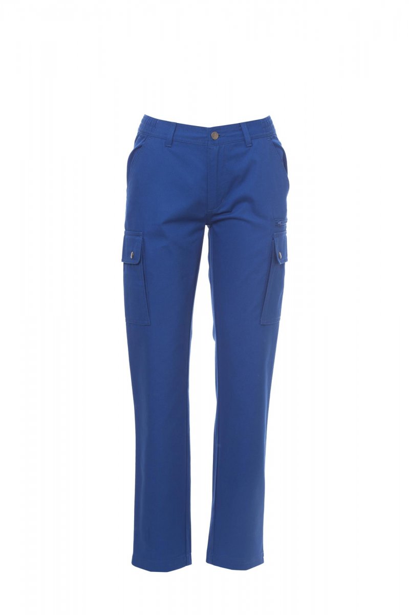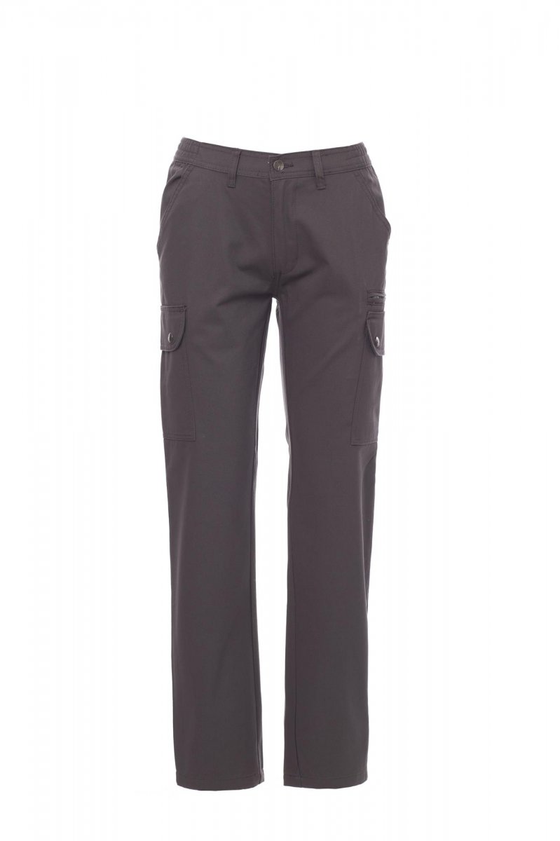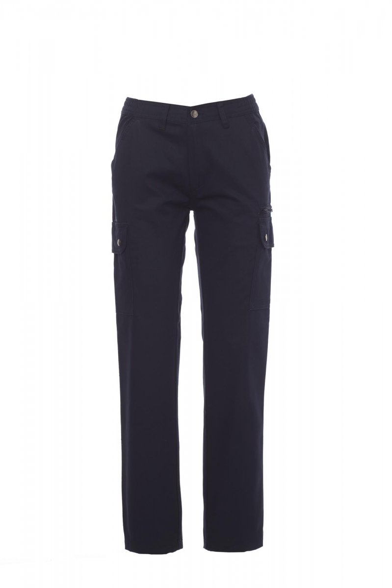Klassieke all-season damesbroek met elastiek opzij en ceintuurlussen. Ritssluiting met metalen knoop, twee zakken voor, twee zakken met klep opzij met kliksluiting, een zak met rits links, een uitvouwbare zak voor rolmaat rechts, twee steekzakken achter met knoop en knoopsgat.