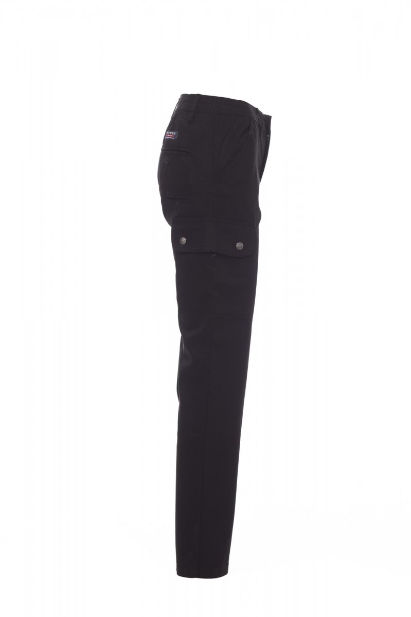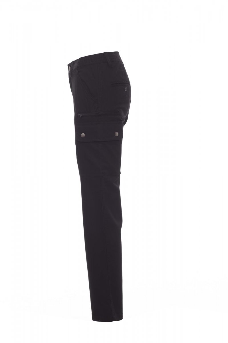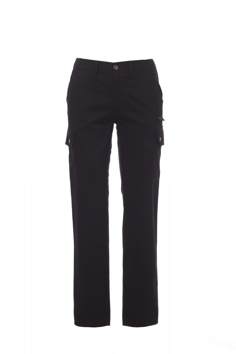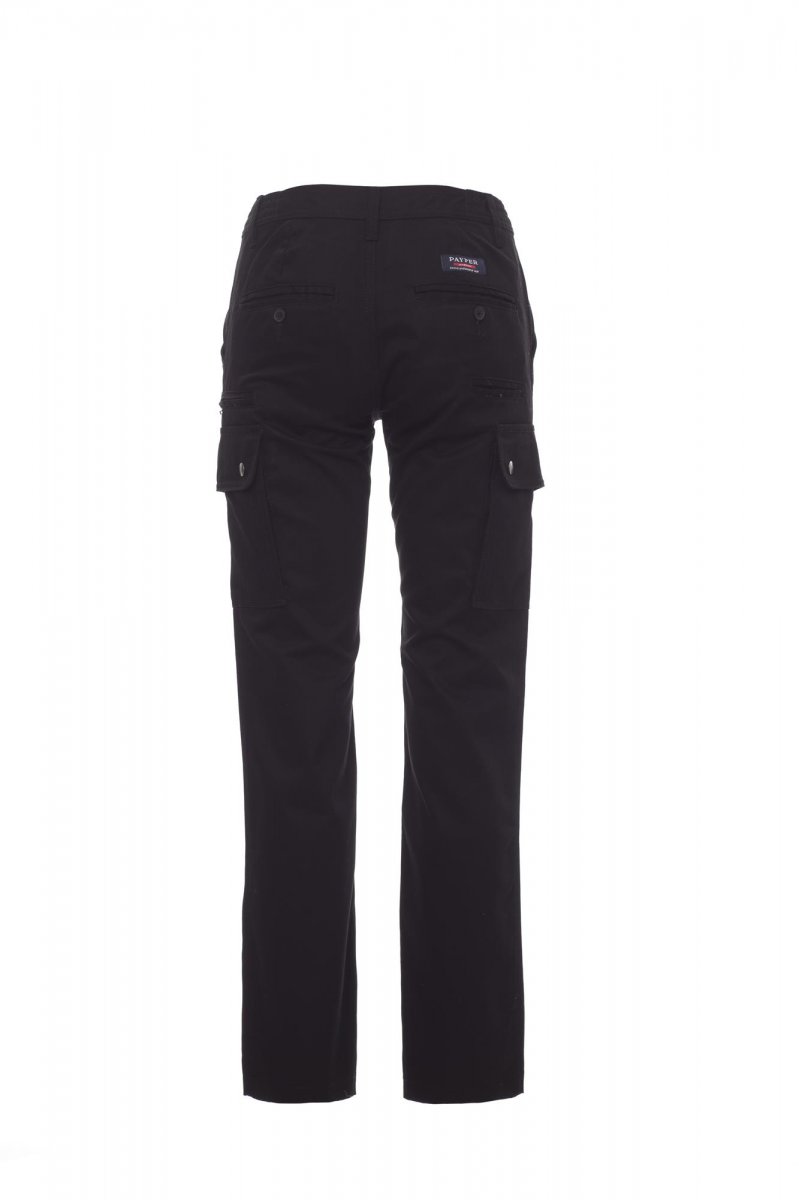 Klassieke all-season damesbroek met elastiek opzij en ceintuurlussen. Ritssluiting met metalen knoop, twee zakken voor, twee zakken met klep opzij met kliksluiting, een zak met rits links, een uitvouwbare zak voor rolmaat rechts, twee steekzakken achter met knoop en knoopsgat.