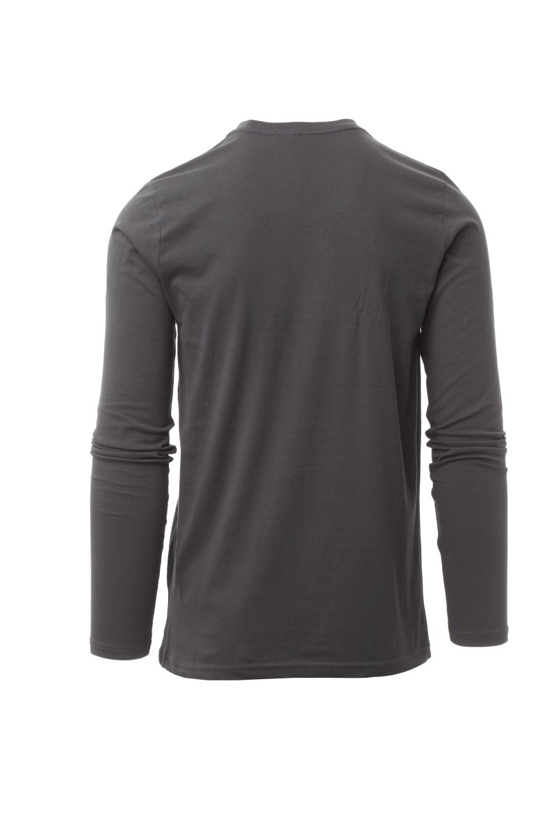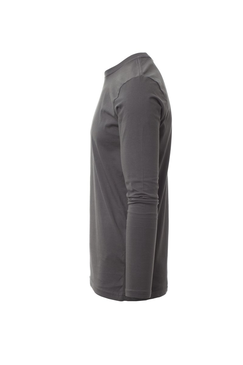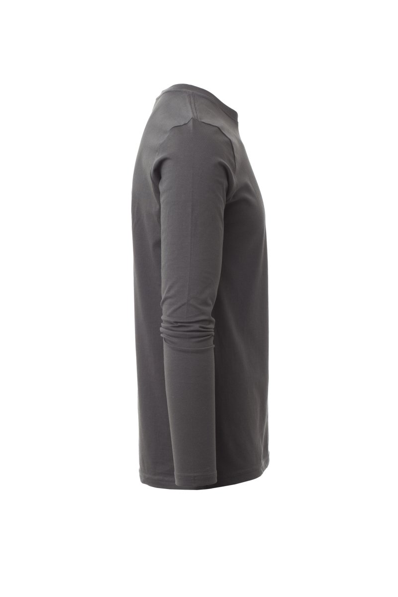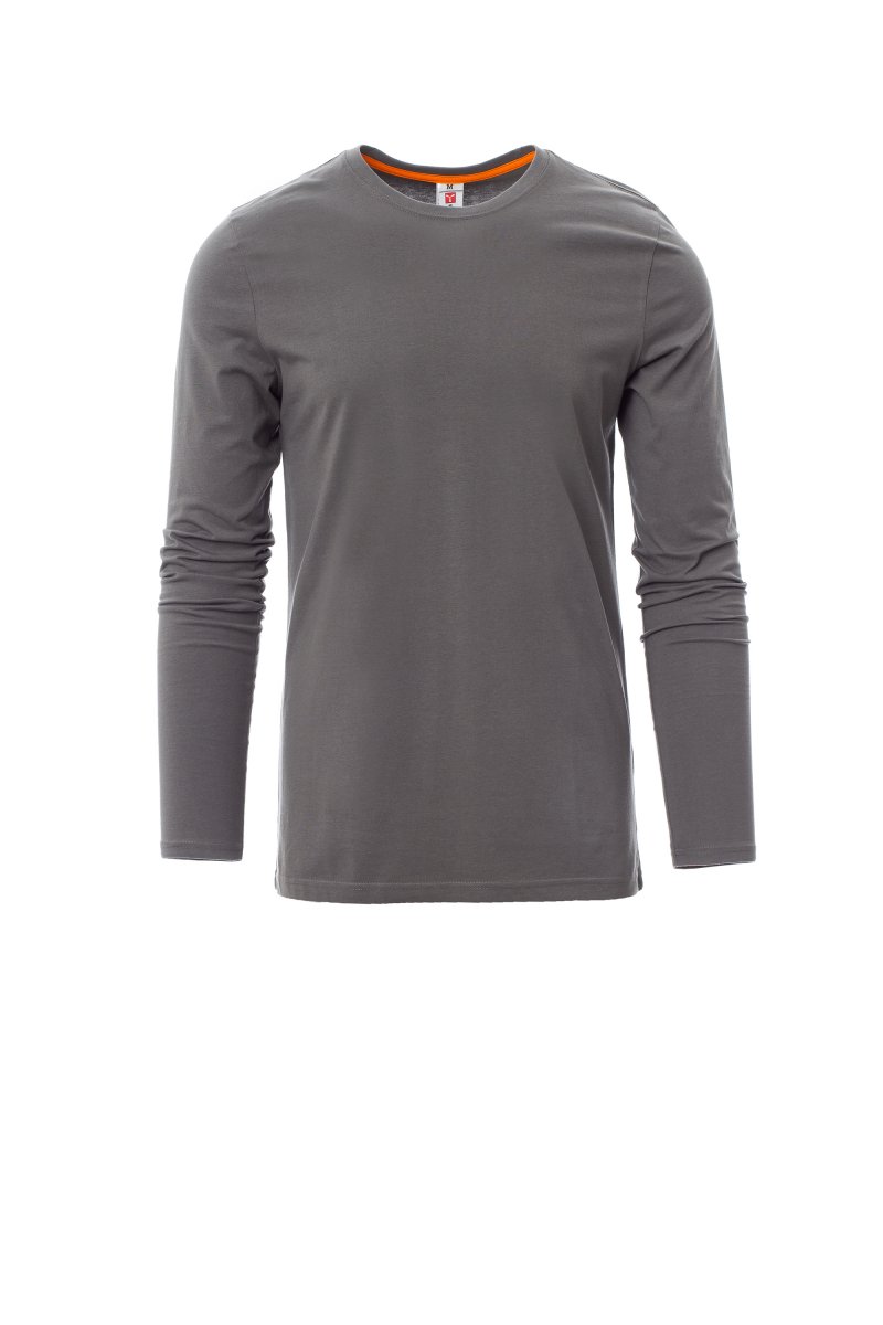 Heren-T-shirt met lange mouwen en ronde hals, met afgezette geribde halsrand van 1,5 cm van een mix met spandex met stiksel aan de buitenkant, contrasterende versterkingsband van schouder naar schouder zichtbaar aan de binnenkant van de nek, elastische naden, zijnaden.