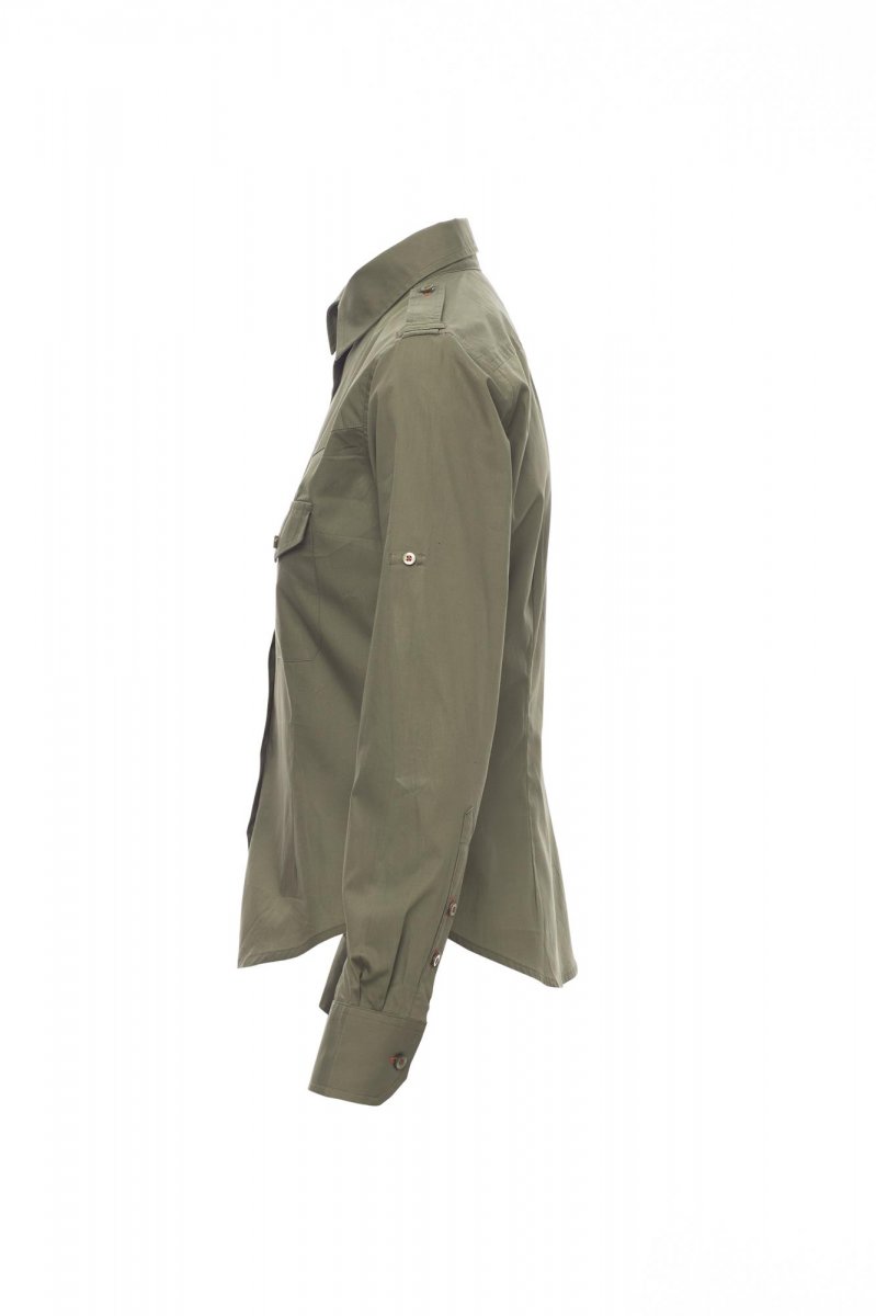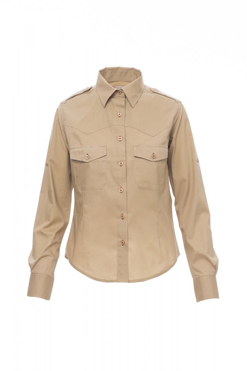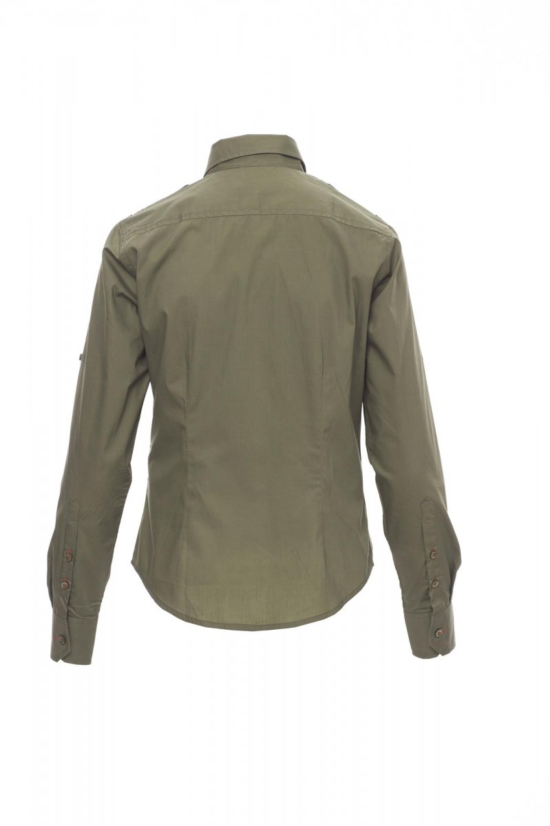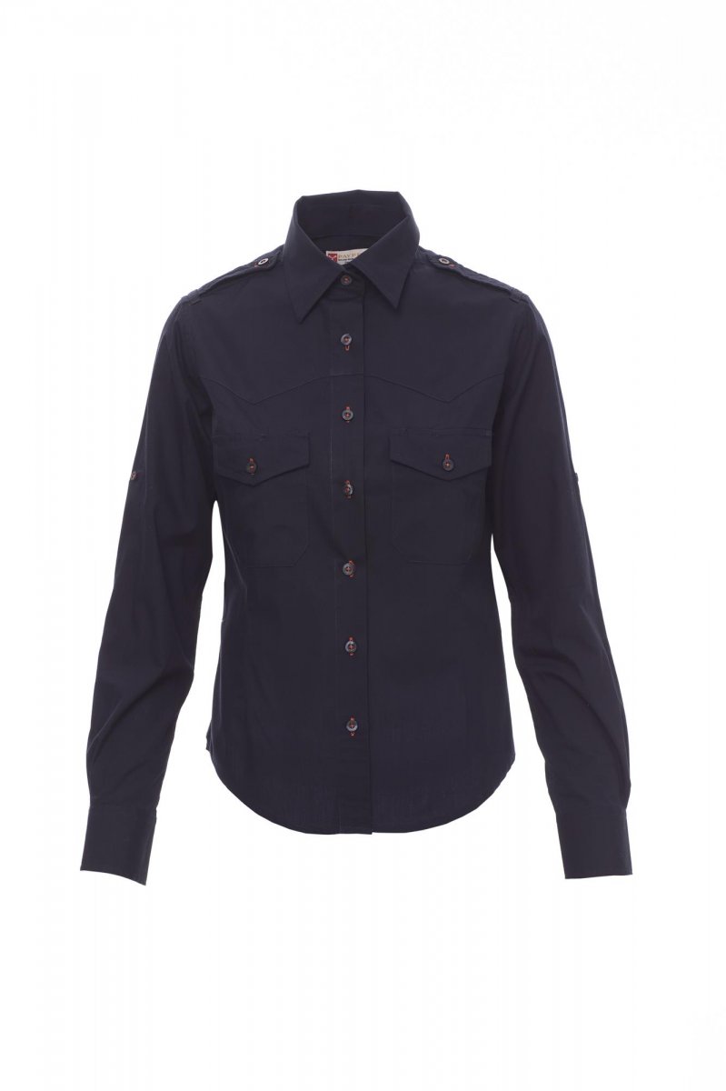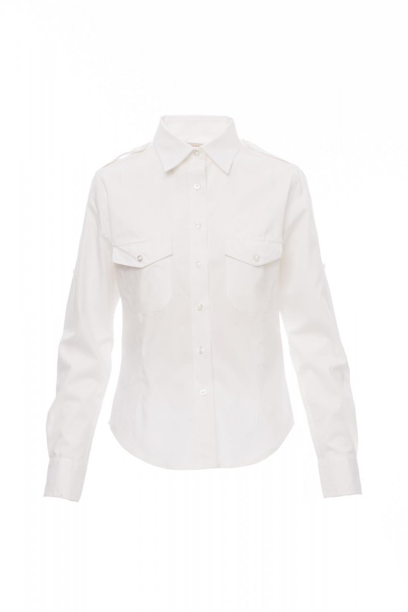 Fijngeweven damesoverhemd van gekamd katoen, licht getailleerd, gevormde schouderpas aan de voorkant (niet bij de witte uitvoering), sluiting met bijpassende knopen en knoopsgaten met contrasterend stiksel (niet bij de witte uitvoering), epauletten, twee borstzakken met klep en penhouderlussen, oprolbare mouwen met handige stofbies en knoop. Gemakkelijk te onderhouden stof.