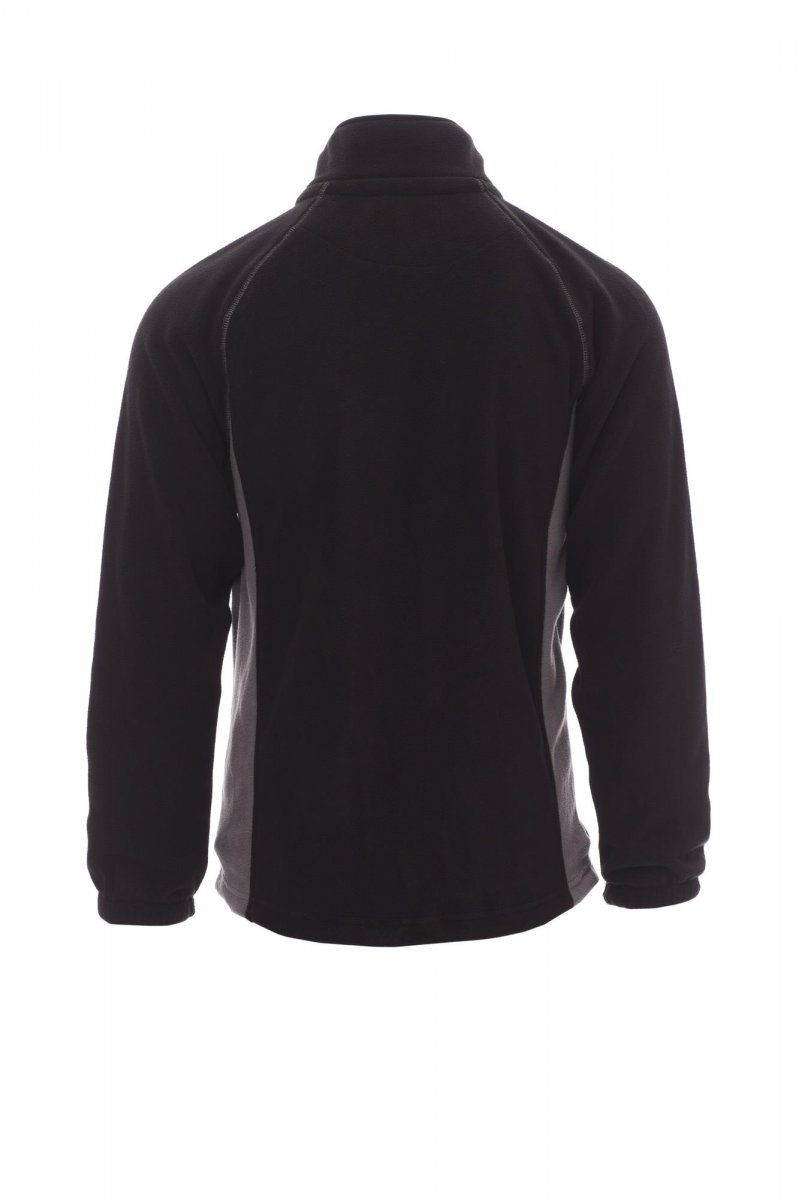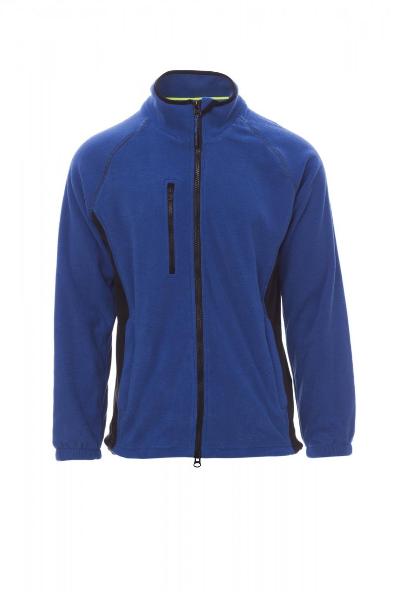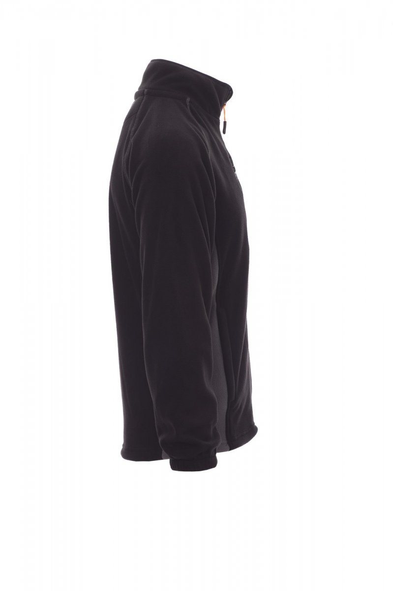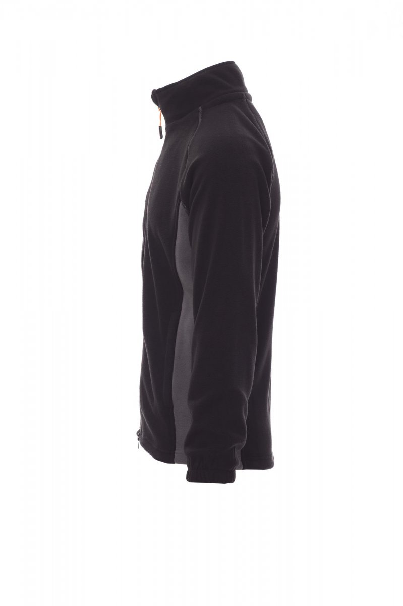 Herenfleecevest in twee kleuren, met rits van 8 mm van zwart kunststof, raglanmouwen, verstelbaar trekkoord in de taille, elastische manchetten, twee zakken met verdekte rits, een zak met rits voor, nek met contrasterende versterkingsband, versterkte naden.