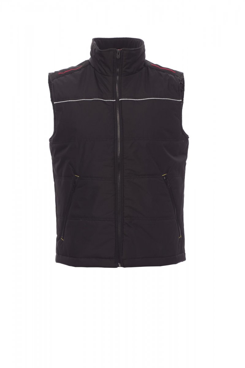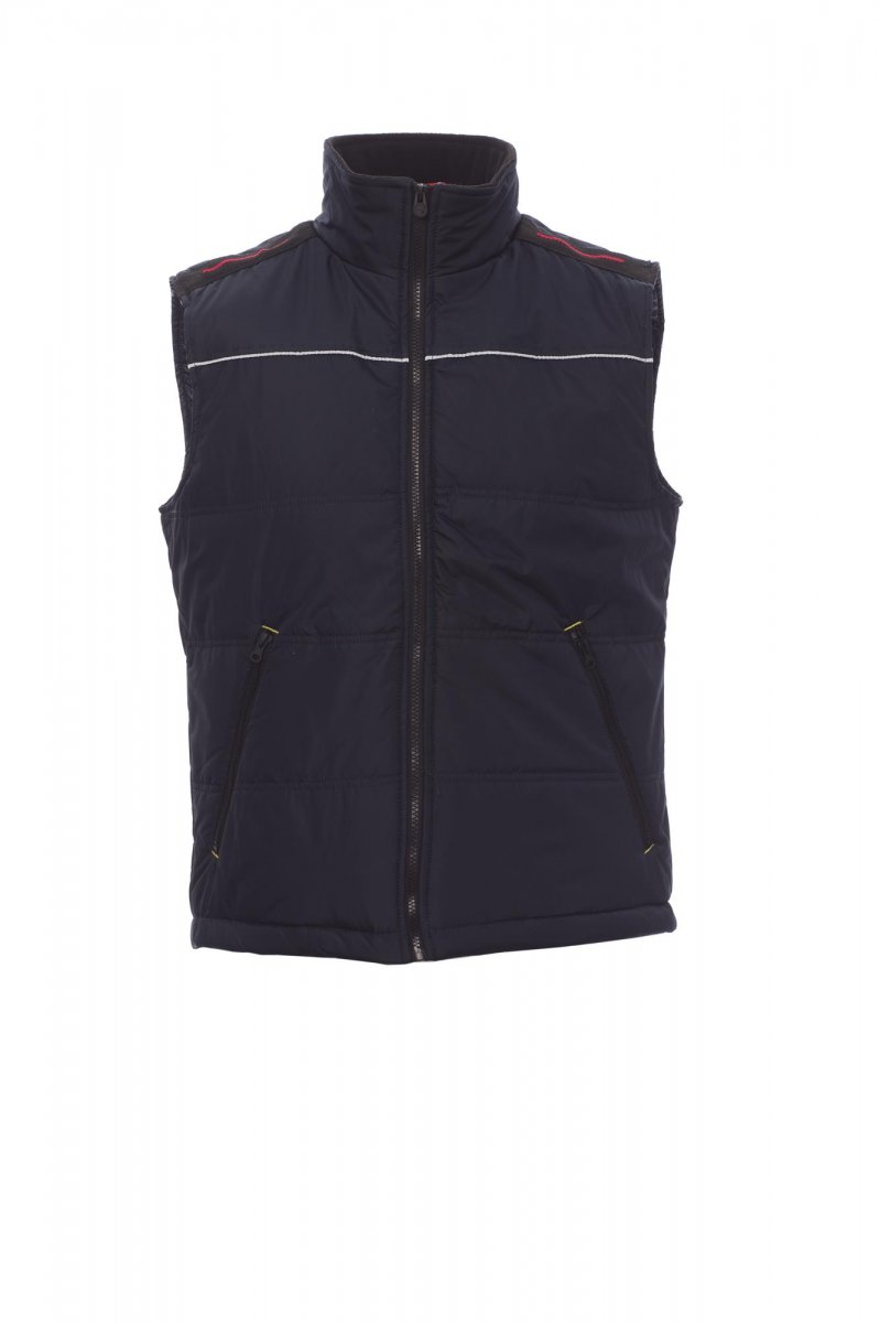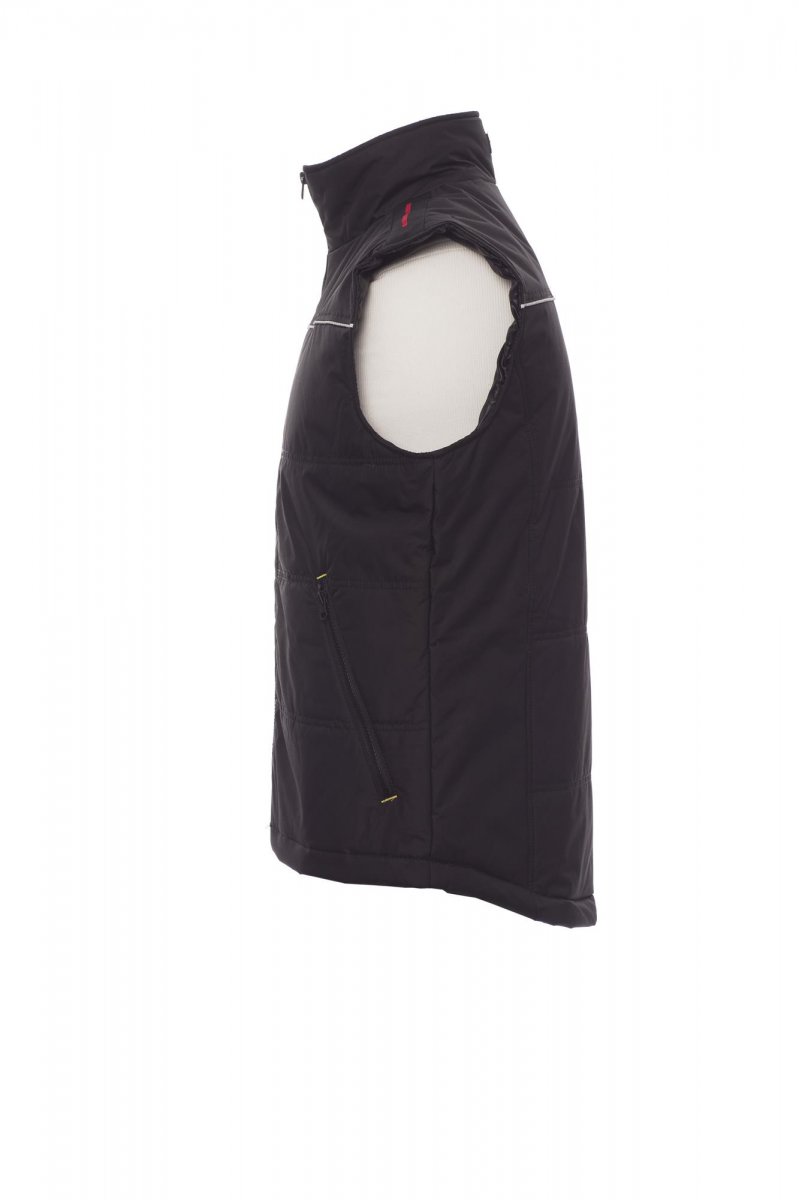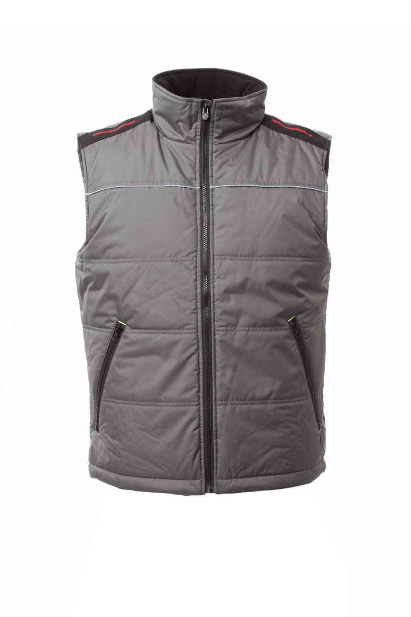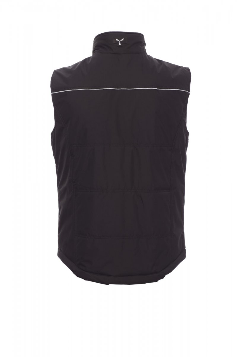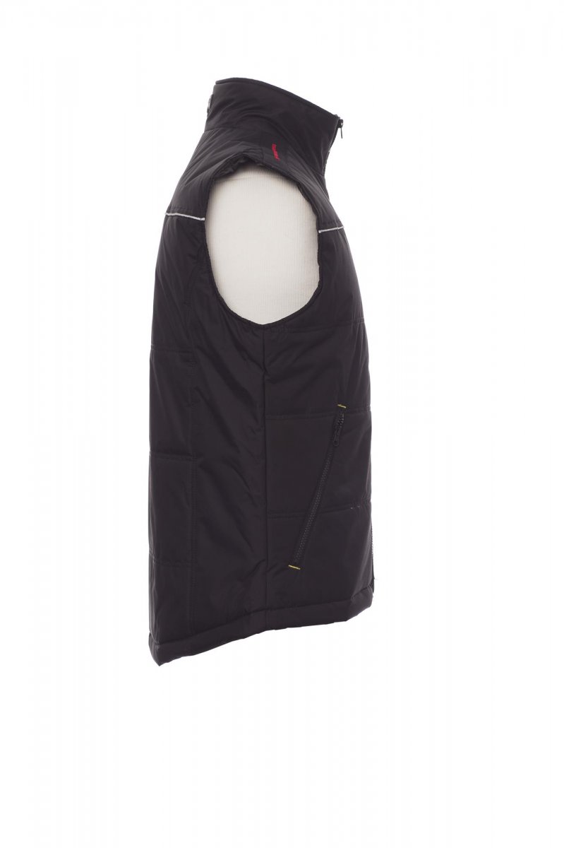 Unisex bodywarmer met kunststof rits van 5 mm met metalen runner, gevormde rug, twee ruime buitenzakken met rits, reflecterende pipingband op de borst en rug. Binnenzijde: doorgestikte gewatteerde voering, afgewerkt met voering met hoge dichtheid, binnenkraag van fleece, een binnenzak.
