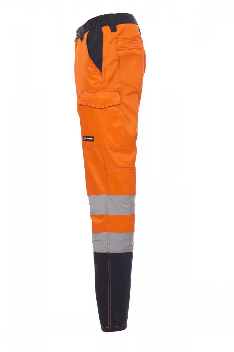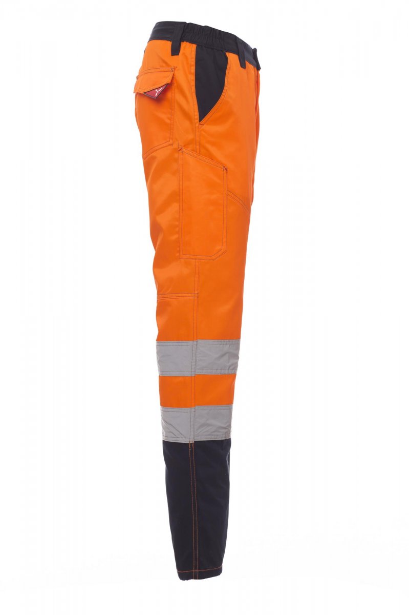 Winterbroek met hoge zichtbaarheid, voor heren, gevoerd met katoenflanel (gewicht 150 g/m²), in twee kleuren, met reflecterende strepen, elastiek opzij en riemlussen. Ritssluiting met kunststof knoop, twee klassieke zakken voor, een zak opzij met het LOCK SYSTEM, een duimstokzak, twee zakken achter, een open en een met klep en klittenband. Contrasterend stiksel, kruis en binnenbeen met driedubbele naad.