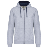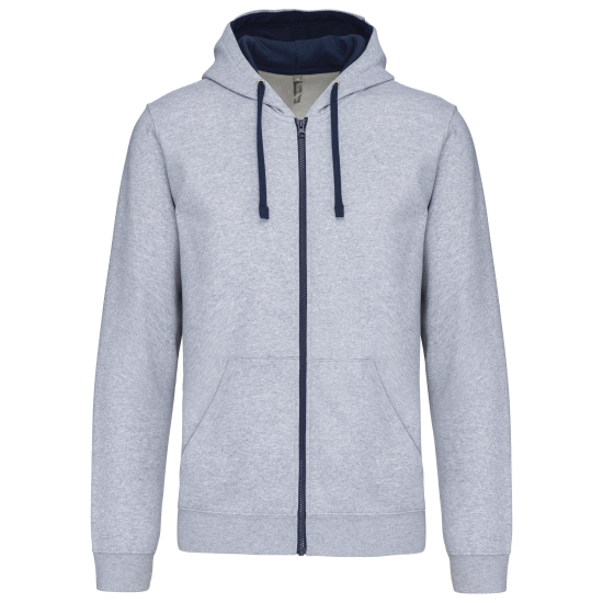 80% katoen / 20% polyester (Oxford Grey: 76% gekamd katoen / 21% polyester / 3% viscose). Geborsteld fleece aan de binnenkant. Gaatje voor draadje in de kangoeroezak en lusje aan de kraag voor oortjes. Ribboord aan mouwuiteinden en onderkant kledingstuk. Gevoerde capuchon in contrasterende kleur met aanrijgkoordjes. Rits in contrasterende kleur. Gecertificeerd STANDARD 100 by OEKO-TEX®N° CQ1007/7, IFTH.